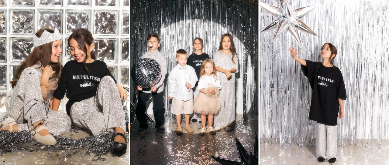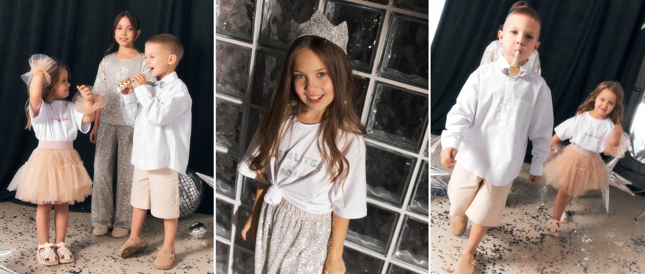 Праздничная капсула получилась особенно атмосферной — будто вдохновлённой снегопадом, огоньками и семейными вечерами. Серебристые акценты, мерцающие пайетки, лёгкая сетка и цвета зимнего воздуха создают ощущение тихой магии. Вещи выглядят нарядно, но остаются очень «тёплыми» по настроению — дети в них не просто красиво одеты, а будто действительно ждут чудо.