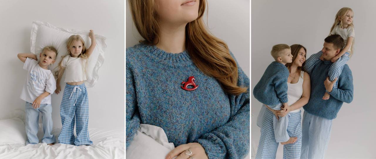 Дополняет картину разнообразие фактур, которое создаёт ощущение настоящего декабрьского волшебства: где-то платье будто светится за счёт сатина, где-то мягкий твид придаёт образу взрослую сдержанность, а металлизированные ткани играют при движении, но не отвлекают от самого ребёнка. А уютная рождественская капсула с пижамами и свитерами в скандинавском стиле создаёт то самое настроение долгих зимних вечеров — когда хочется забраться под плед, слушать новогодние истории и ждать чуда.