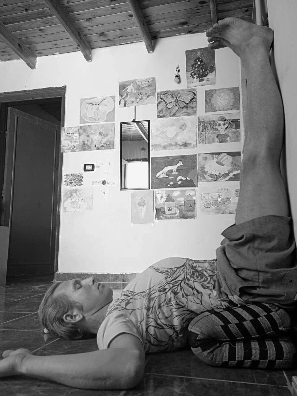 Уложите себя на валик ногами кверху, как показано на фото. Ноги вплотную к стене, живот параллелен полу. Оставайтесь в позе 3-5 минут.